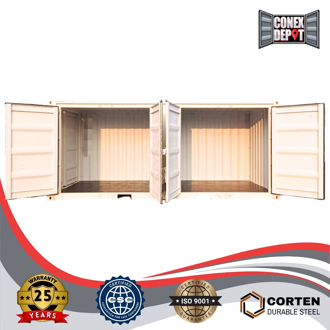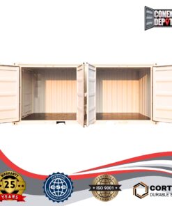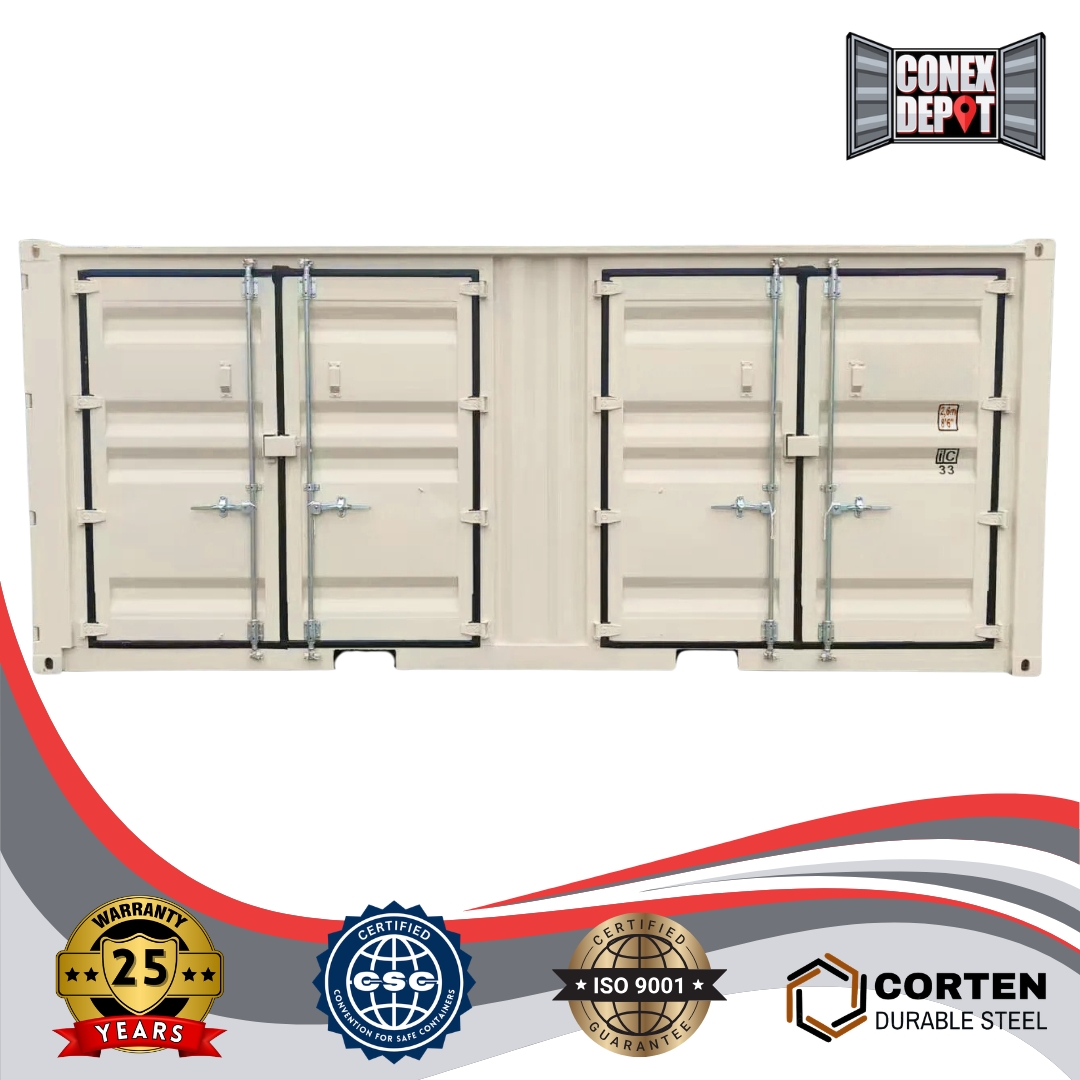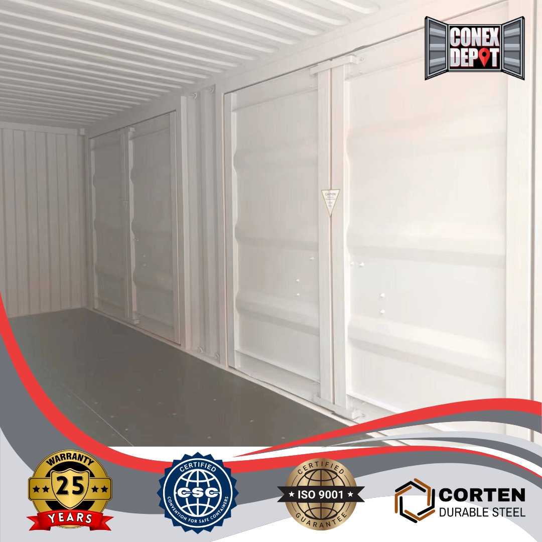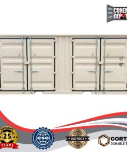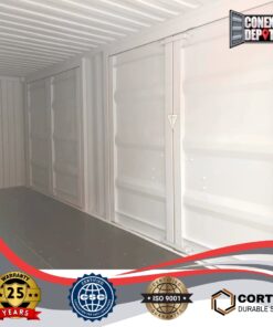 20FT Side Opening Shipping Containers come in two varieties. The unit displayed here was two sets of double doors on one side of the container and another set of double doors on one end. The other version, which has a higher list price, is the full open side shipping container.