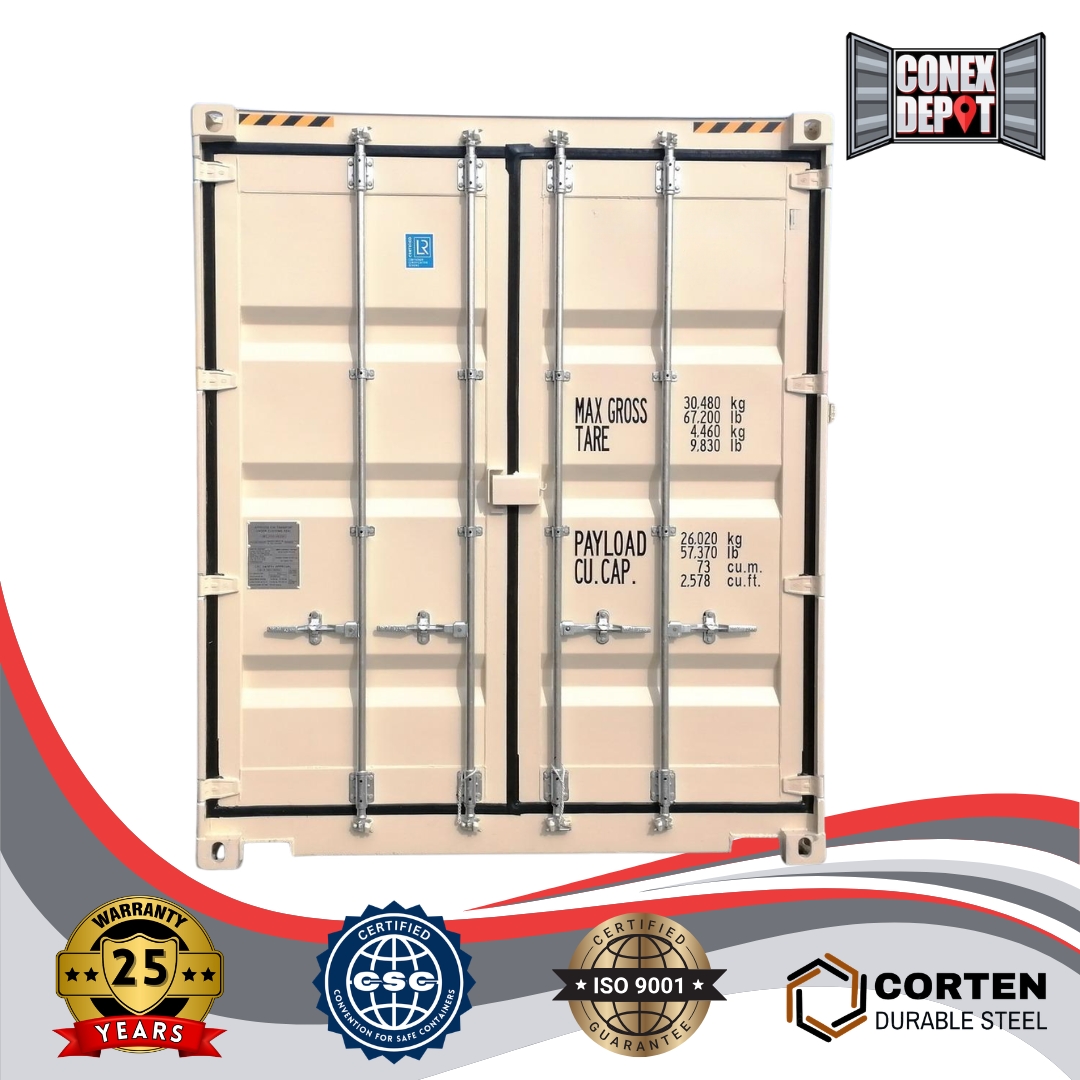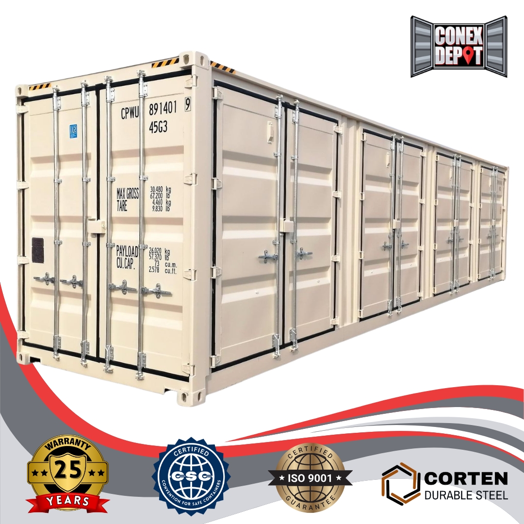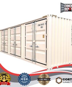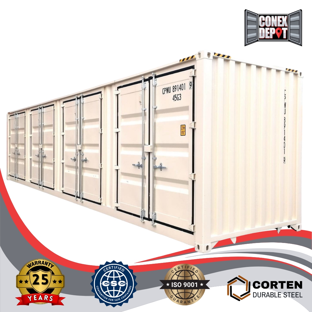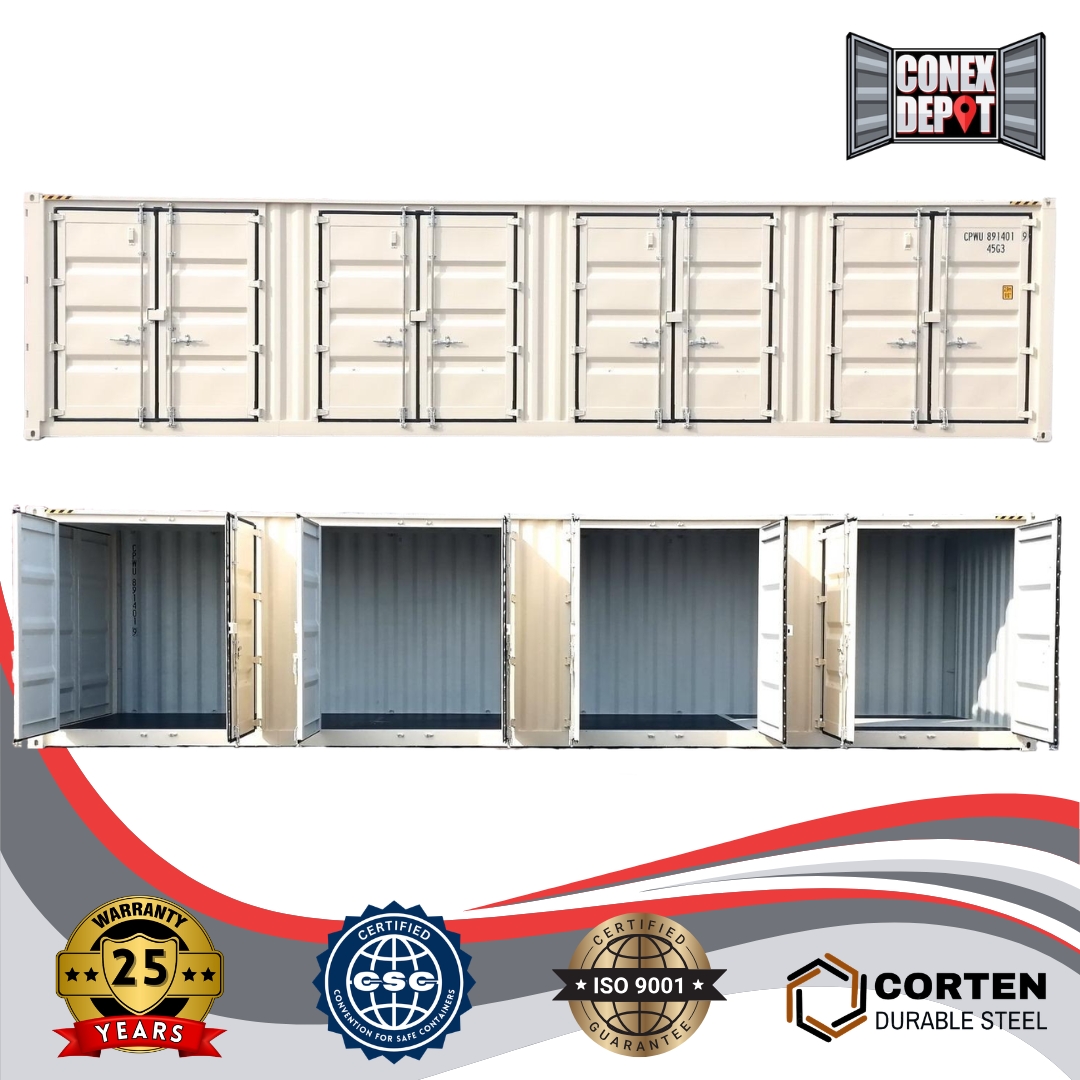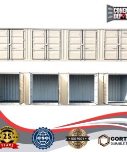 The four-door side-opening shipping container is a popular alternative to the full open side Flagship container, with a slightly cheaper list price. It has four sets of double doors along one side of the container and one set of double doors at one end. Brilliant Conex engineering and versatility. Available in limited locations only, but Conex Depot can transport and deliver it to anywhere in North America.